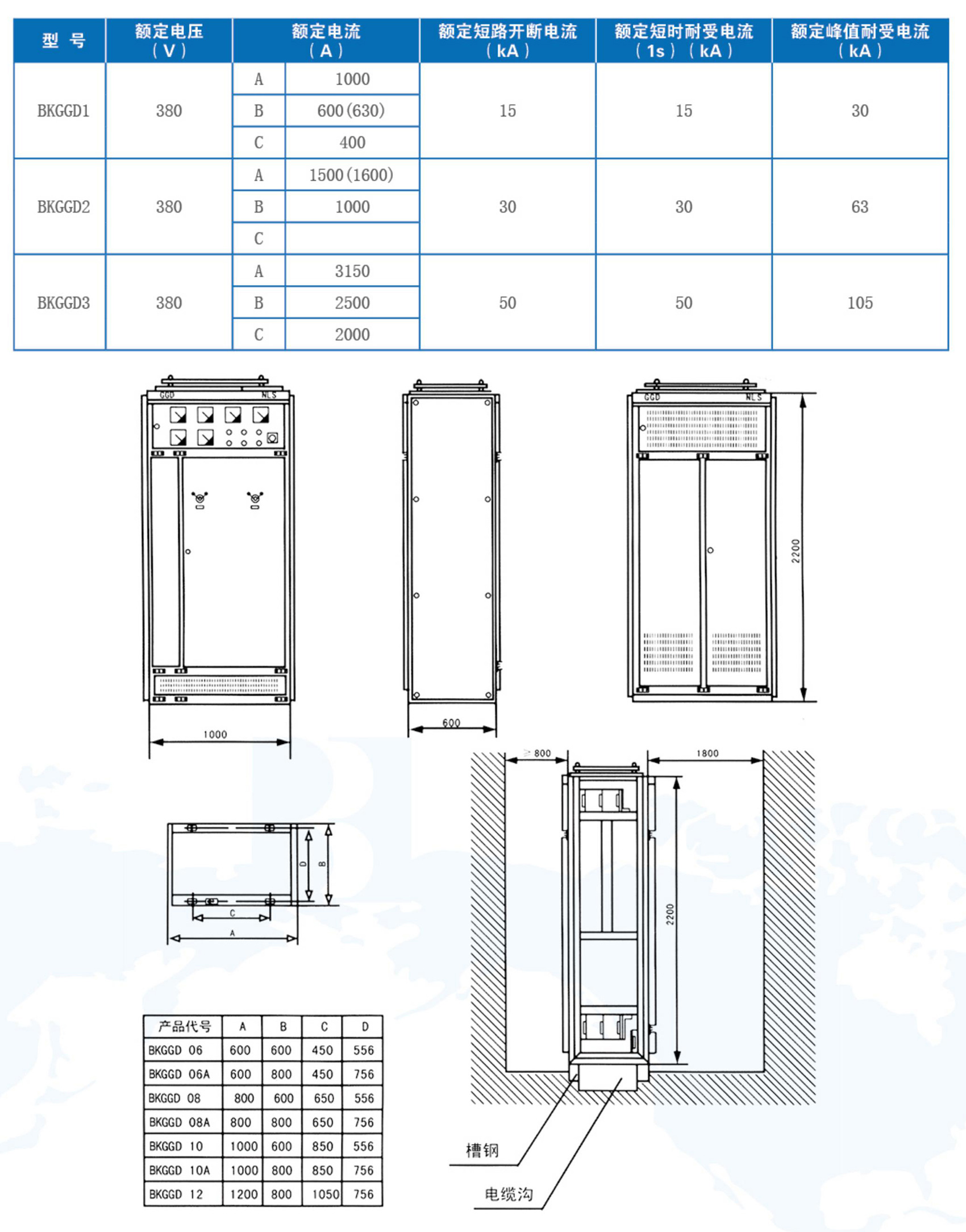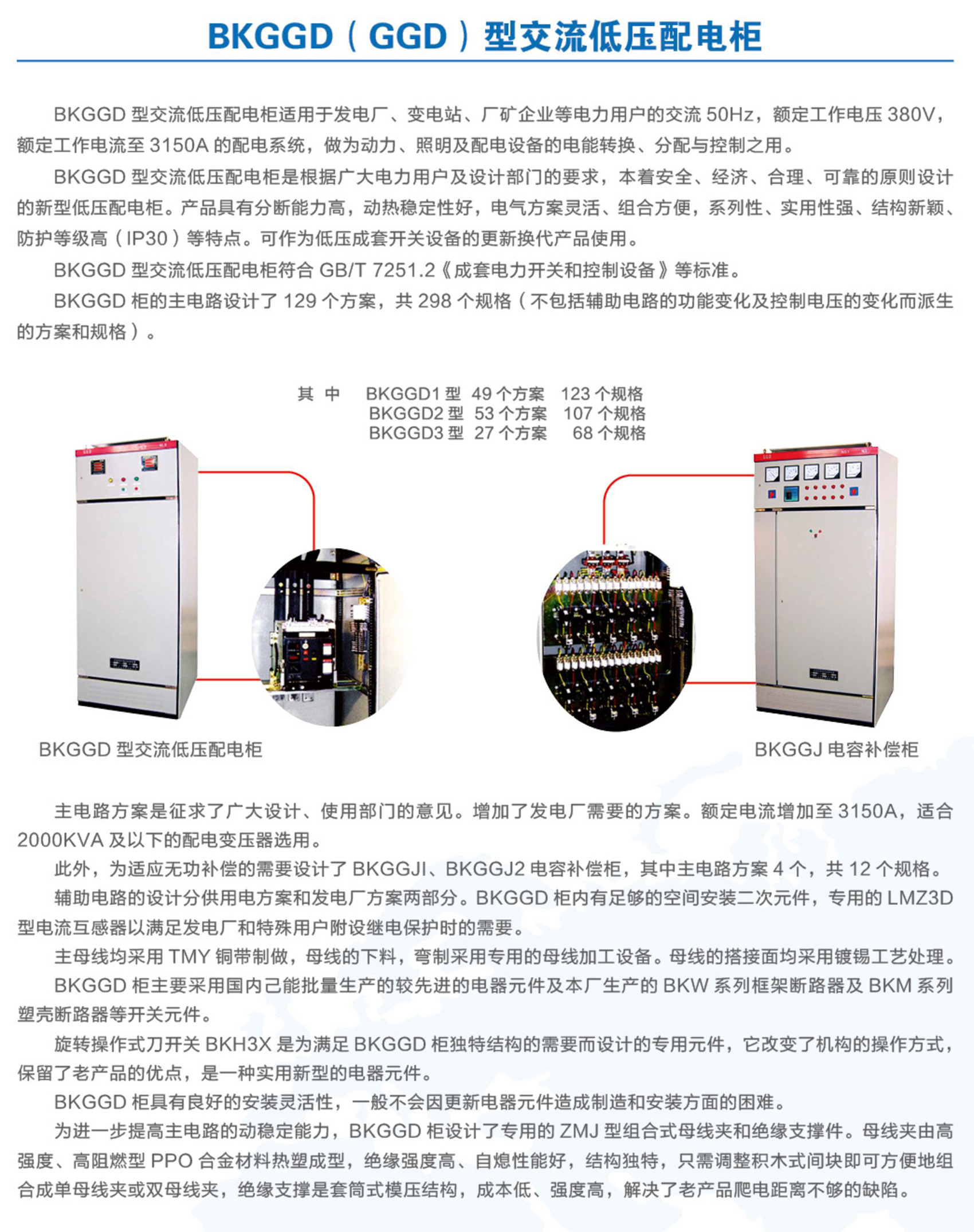 BKGGD型交流低壓配電柜適用于發(fā)電廠、變電站、廠礦企業(yè)等電力用戶的交流50Hz,額定工作電壓380V,額定工作電流至3150A的配電系統(tǒng),做為動力、照明及配電設(shè)備的電能轉(zhuǎn)換、分配與控制之用。BKGGD型交流低壓配電柜是根據(jù)廣大電力用戶及設(shè)計部門的要求,本著安全、經(jīng)濟、合理、可靠的原則設(shè)計的新型低壓配電柜。產(chǎn)品具有分?jǐn)嗄芰Ω撸瑒訜岱€(wěn)定性好,電氣方案靈活、組合方便,系列性、實用性強、結(jié)構(gòu)新穎、防護等級高等特點??勺鳛榈蛪撼商组_關(guān)設(shè)備的更新?lián)Q代產(chǎn)品使用。