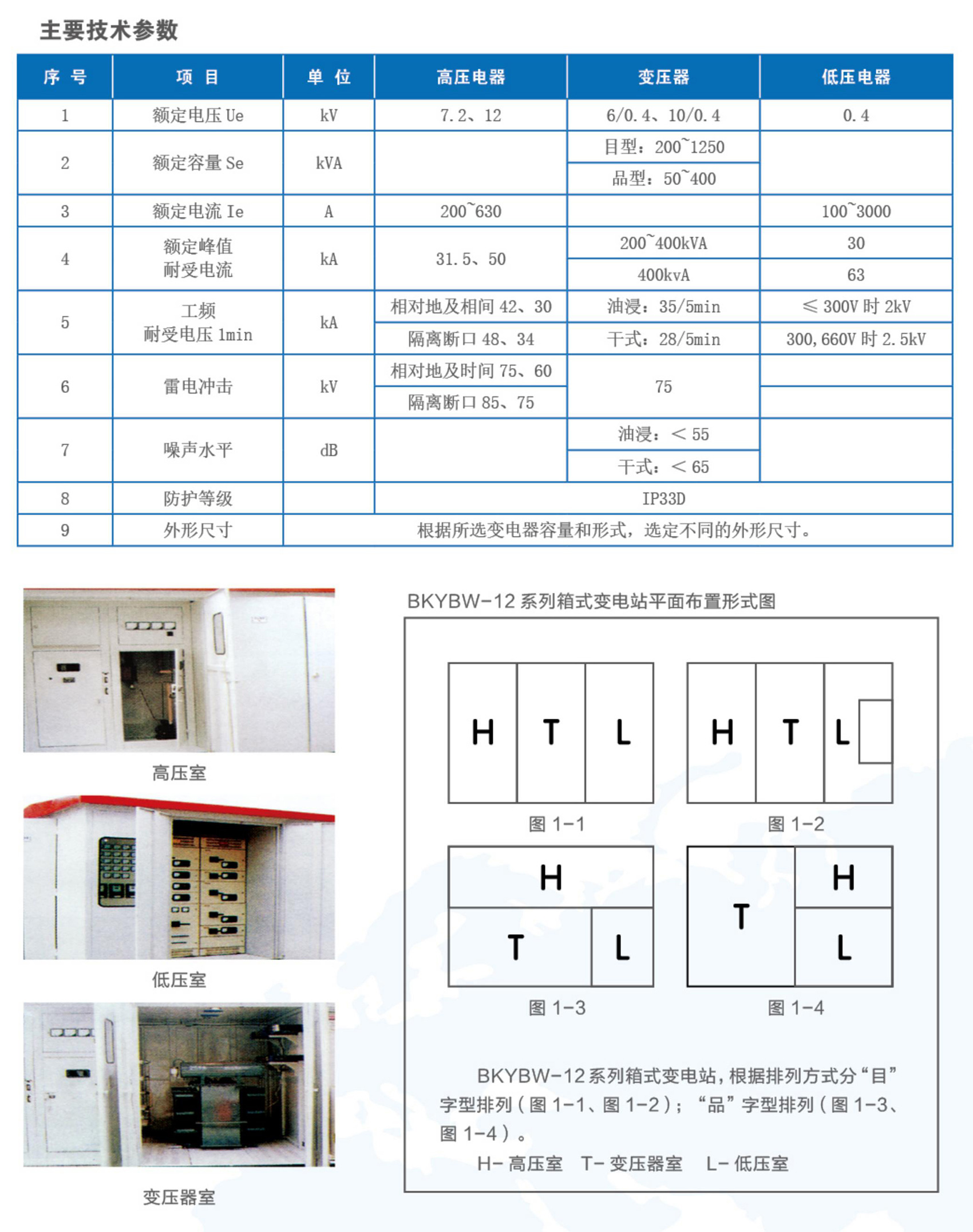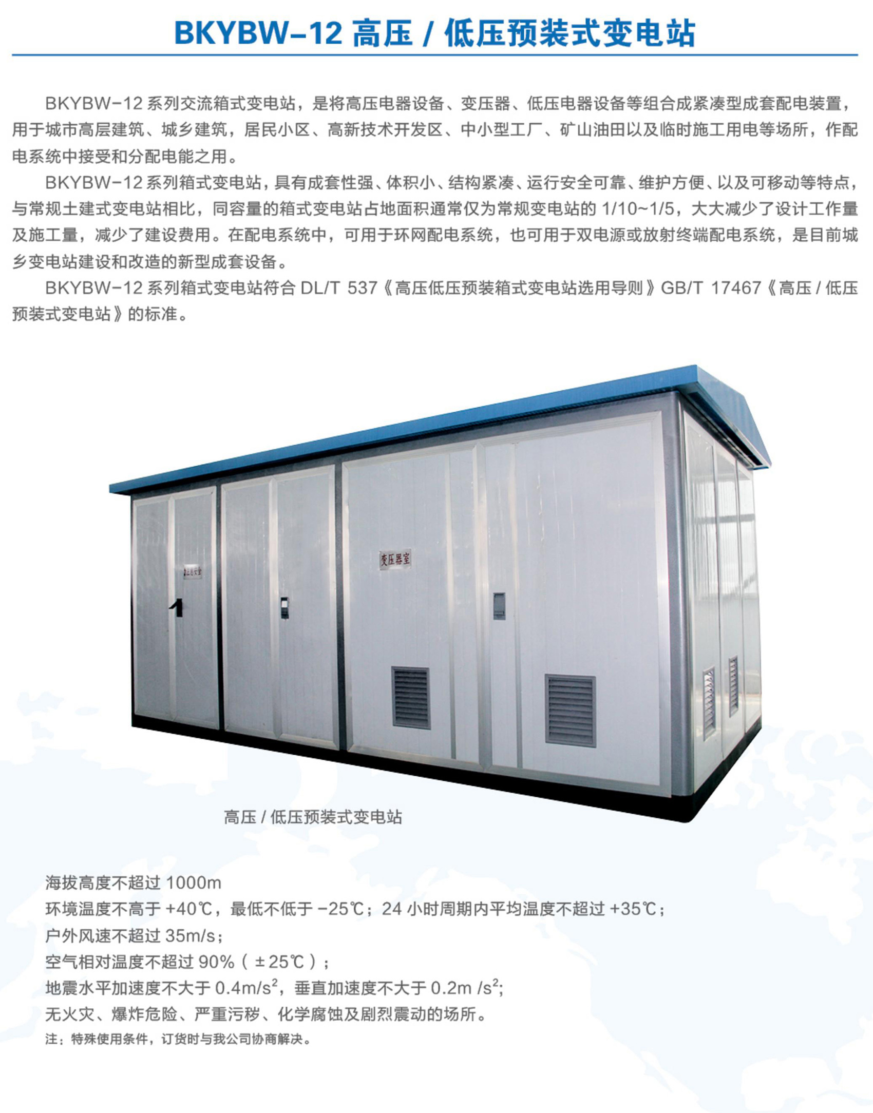 BKYBW-12系列交流箱式變電站,是將高壓電器設(shè)備、變壓器、低壓電器設(shè)備等組合成緊湊型成套配電裝置,用于城市高層建筑、城鄉(xiāng)建筑,居民小區(qū)、高新技術(shù)開發(fā)區(qū)、中小型工廠、礦山油田以及臨時施工用電等場所,作配電系統(tǒng)中接受和分配電能之用。BKYBW-12系列箱式變電站,具有成套性強(qiáng)、體積小、結(jié)構(gòu)緊湊、運行安全可靠、維護(hù)方便、以及可移動等特點,與常規(guī)土建式變電站相比,同容量的箱式變電站占地面積通常僅為常規(guī)變電站的1/10~1/5,大大減少了設(shè)計工作量及施工量,減少了建設(shè)費用。在配電系統(tǒng)中,可用于環(huán)網(wǎng)配電系統(tǒng),也可用于雙電源或放射終端配電系統(tǒng),是目前城鄉(xiāng)變電站建設(shè)和改造的新型成套設(shè)備。