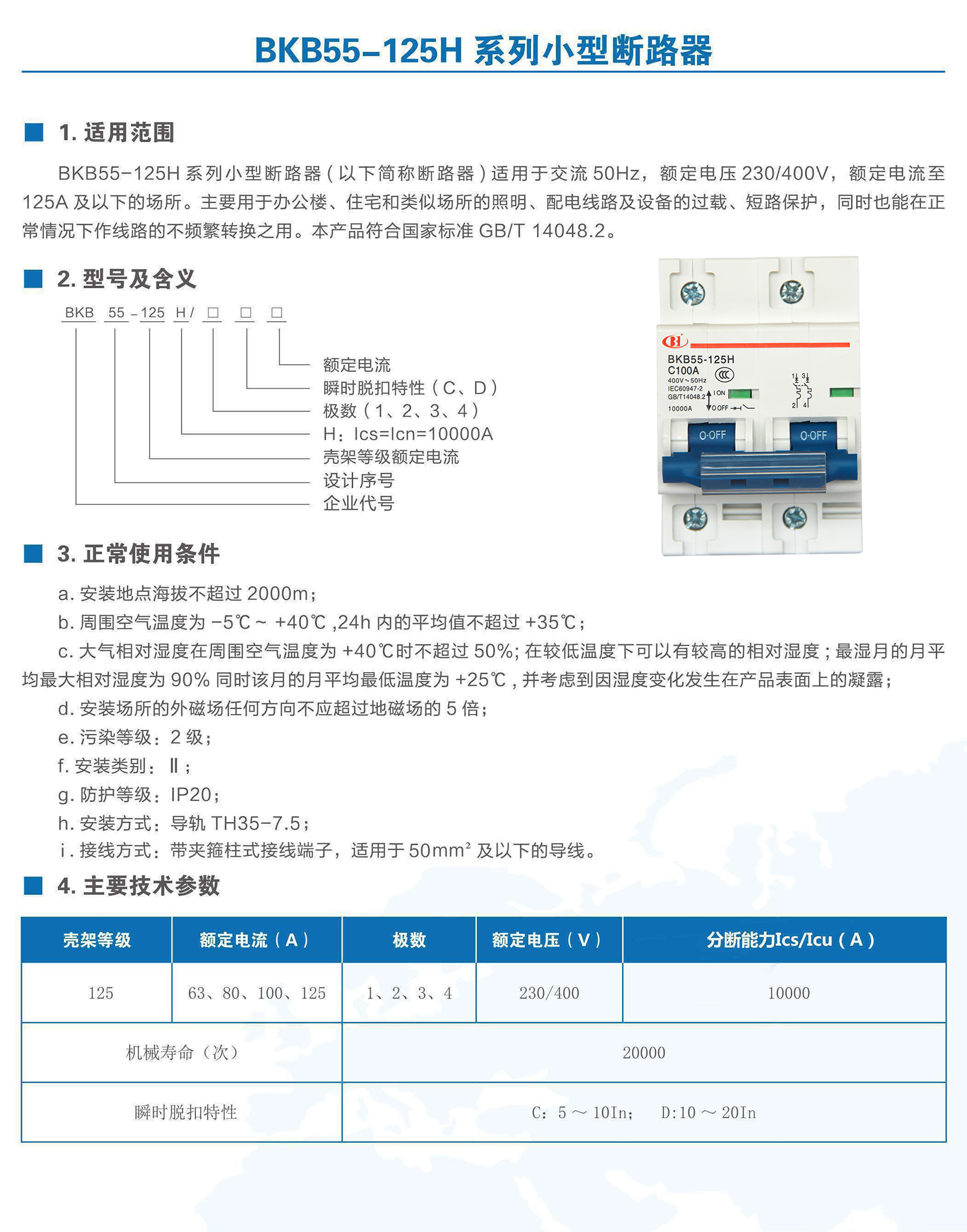 BKB55-125H系列小型斷路器適用于交流50Hz,額定電壓至400V,額定電流63~125A的系統(tǒng)線路中。用來(lái)對(duì)建筑電廠、變電站、電信、交通、冶金、工礦業(yè)等及類似場(chǎng)所的系統(tǒng)線路、電氣設(shè)備進(jìn)行過(guò)電流保護(hù),也可以用于不頻繁的通斷操作。適用于非專業(yè)人員使用且不需要進(jìn)行維護(hù)。本產(chǎn)品符合GB/T 14048.2、IEC 60947-2標(biāo)準(zhǔn)。