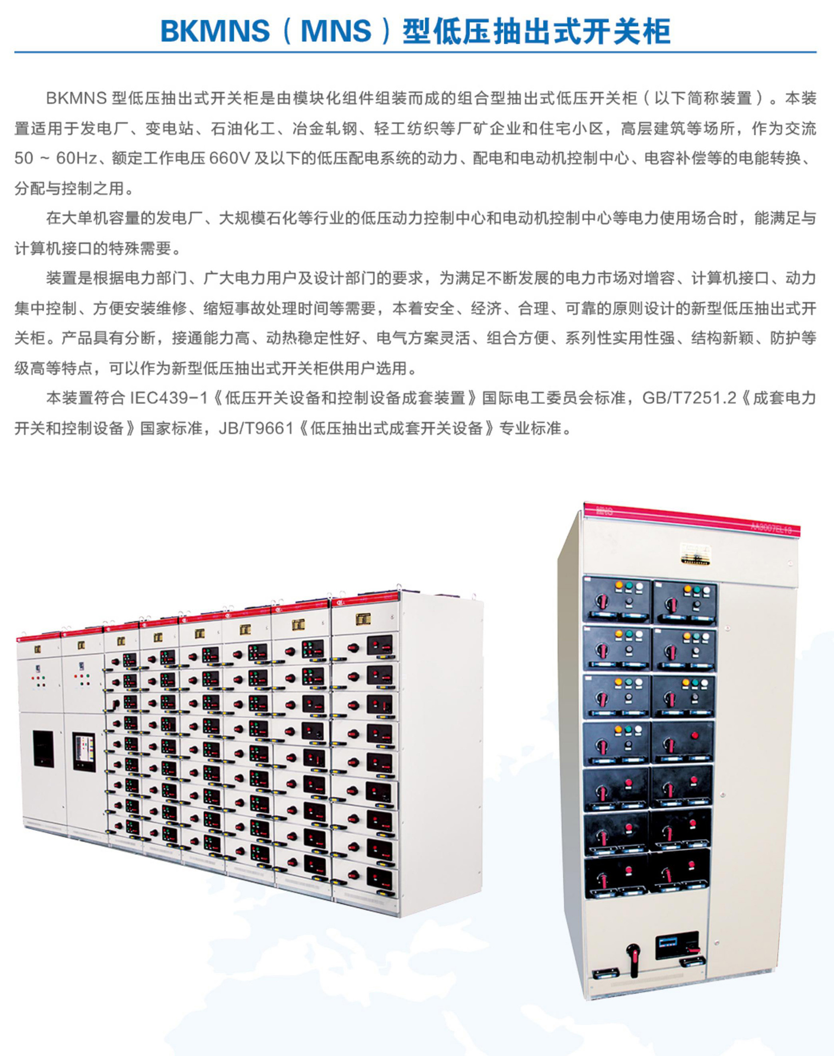BKMNS 型低壓抽出式開關柜是由模塊化組件組裝而成的組合型抽出式低壓開關柜(以下簡稱裝置)。本裝置適用于發(fā)電廠、變電站、石油化工、冶金軋鋼、輕工紡織等廠礦企業(yè)和住宅小區(qū),高層建筑等場所,作為交流50~60Hz、額定工作電壓660V及以下的低壓配電系統(tǒng)的動力、配電和電動機控制中心、電容補償?shù)鹊碾娔苻D換、分配與控制之用。在大單機容量的發(fā)電廠、大規(guī)模石化等行業(yè)的低壓動力控制中心和電動機控制中心等電力使用場合時,能滿足與計算機接口的特殊需要。裝置是根據(jù)電力部門、廣大電力用戶及設計部門的要求,為滿足不斷發(fā)展的電力市場對增容、計算機接口、動力集中控制、方便安裝維修、縮短事故處理時間等需要,本著安全、經(jīng)濟、合理、可靠的原則設計的新型低壓抽出式開關柜。產(chǎn)品具有分斷,接通能力高、動熱穩(wěn)定性好、電氣方案靈活、組合方便、系列性實用性強、結構新穎、防護等級高等特點,可以作為新型低壓抽出式開關柜供用戶選用。