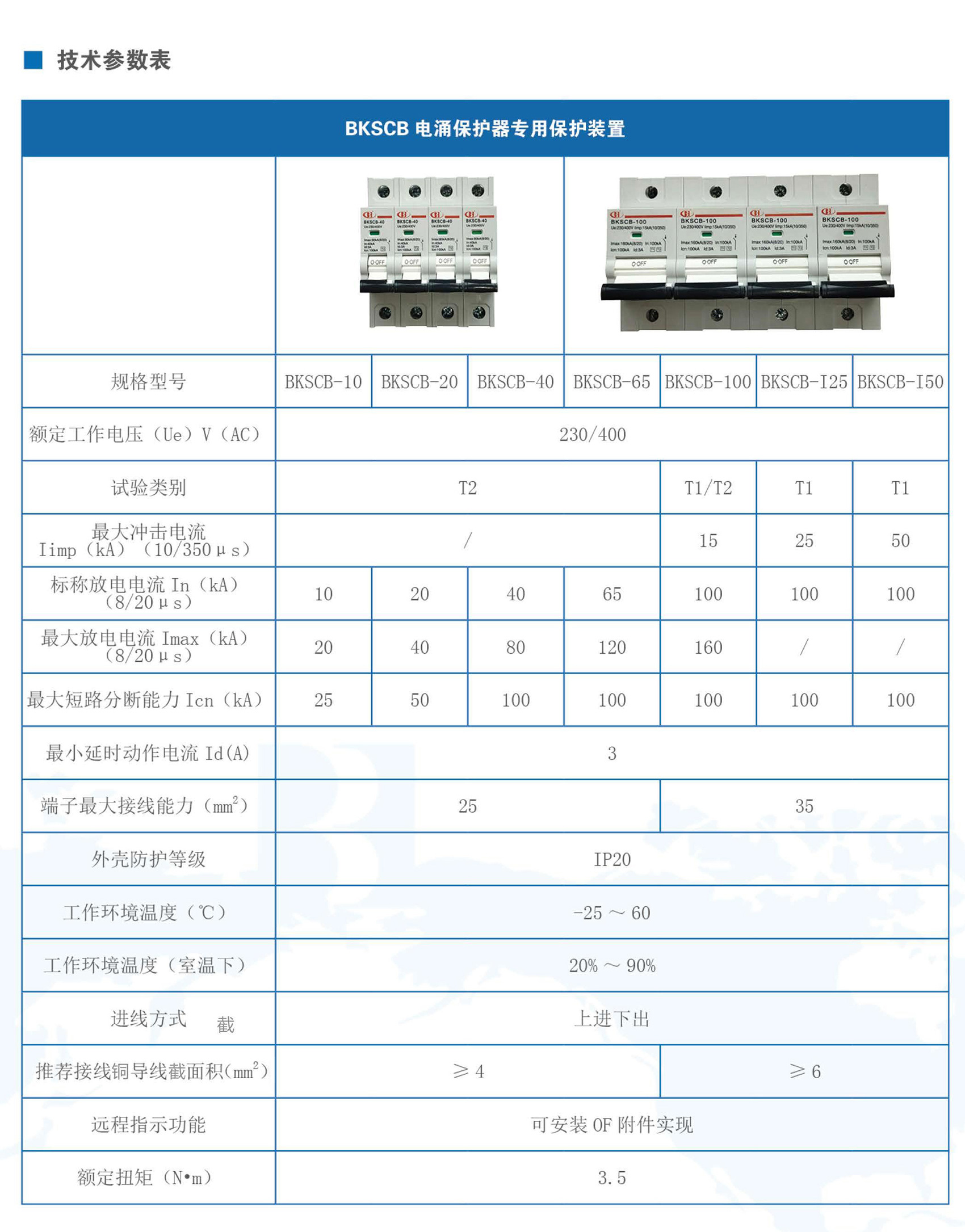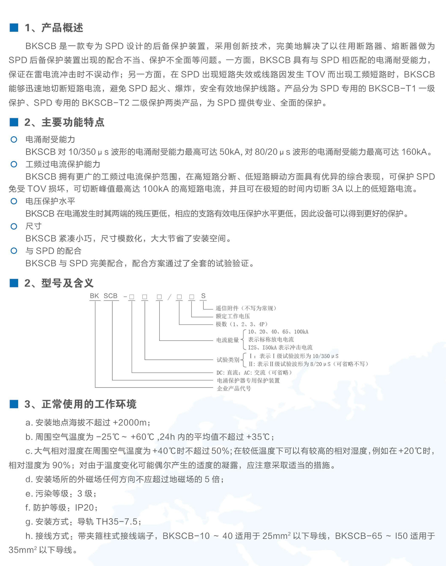 BKSCB系列電涌保護器專用保護裝置適用于交流50Hz/60Hz、額定工作電壓至400V,需安裝SPD(防雷保護器)設備的電路中,為試驗類別為Ⅰ類和II類的電涌保護器提供專業(yè)的后備保護。本產(chǎn)品符合NB/T 42150標準。