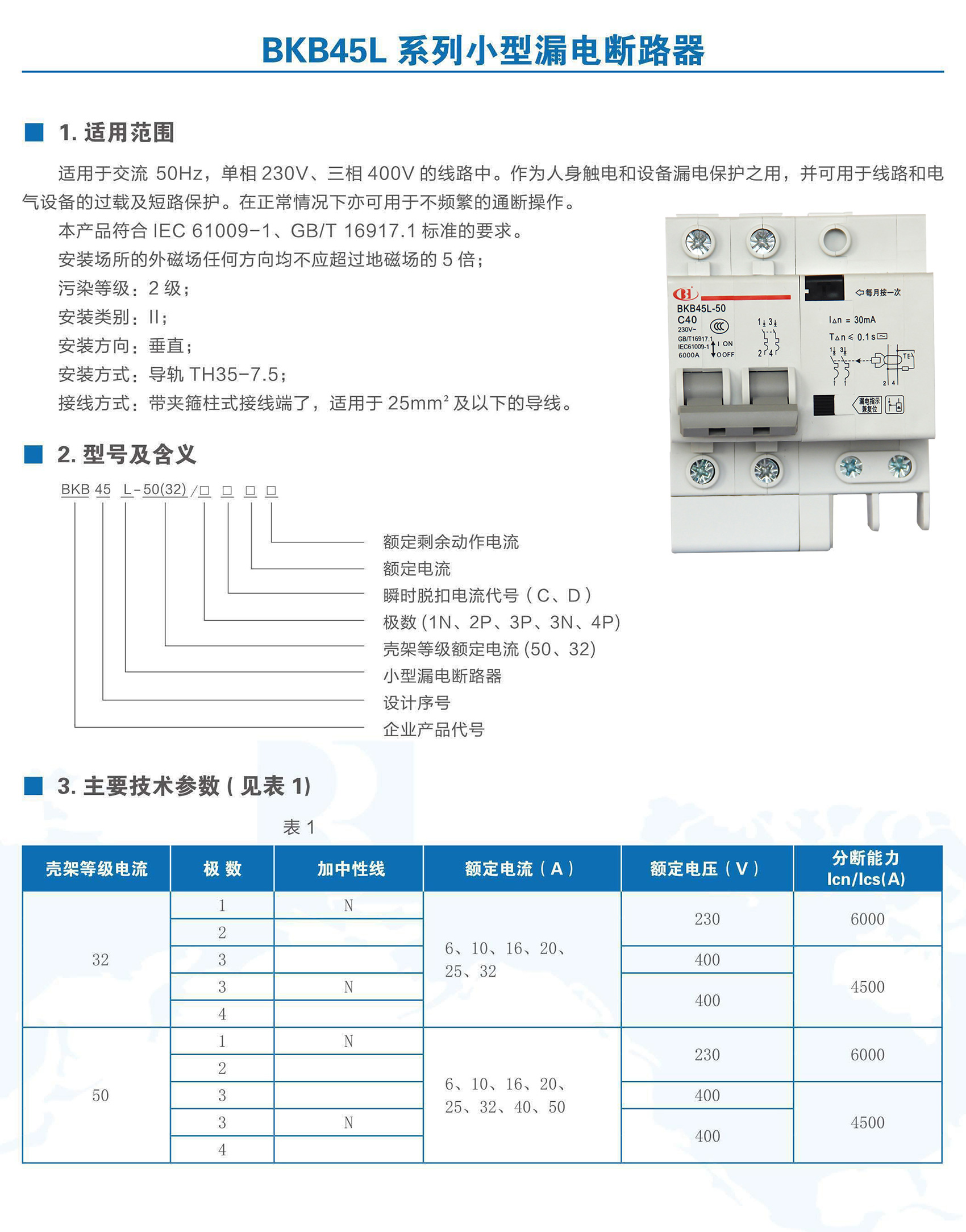 BKB45L-50系列帶剩余電流保護(hù)小型斷路器適用于交流50Hz、額定電壓至400V,額定電流6~50A 的線路中。作為人身觸電和設(shè)備漏電保護(hù)之用,并可用于線路和電氣設(shè)備的過(guò)載以及短路保護(hù)。在正常情況下亦可用于不頻繁的通斷操作。本產(chǎn)品符合GB/T 16917.1、IEC 61009-1標(biāo)準(zhǔn)。