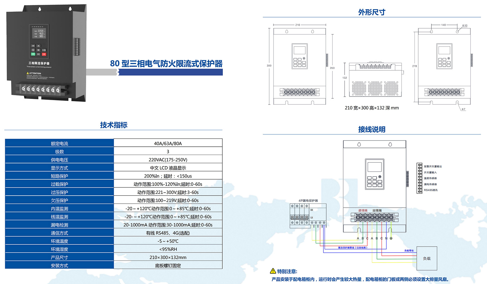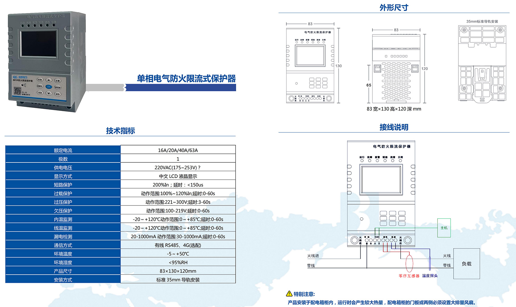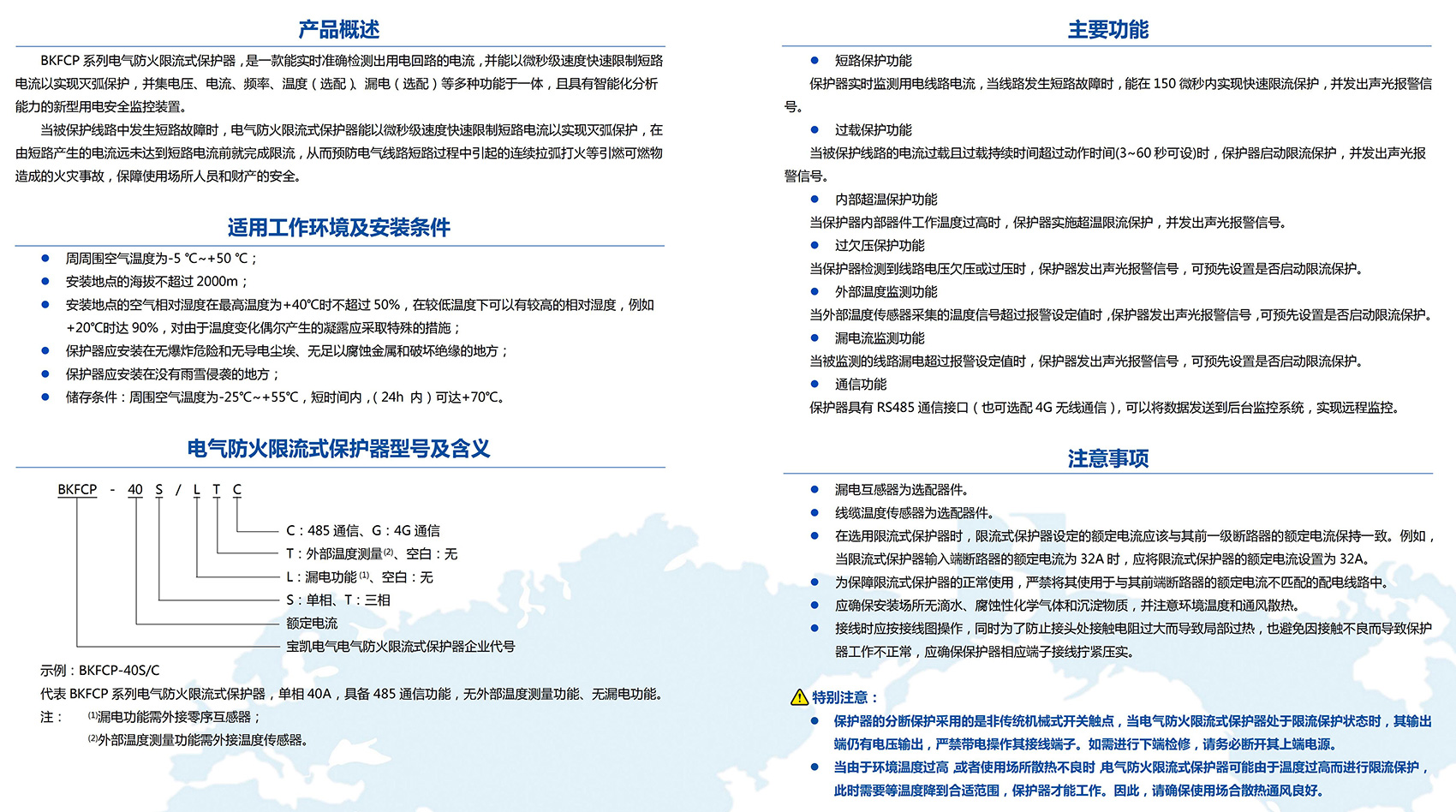 BKFCP系列電氣防火限流式保護(hù)器,是一款能實(shí)時(shí)準(zhǔn)確檢測(cè)出用電回路的電流,并能以微秒級(jí)速度快速限制短路電流以實(shí)現(xiàn)滅弧保護(hù),并集電壓、電流、頻率、溫度(選配)、漏電(選配)等多種功能于一體,且具有智能化分析能力的新型用電安全監(jiān)控裝置。當(dāng)被保護(hù)線路中發(fā)生短路故障時(shí),電氣防火限流式保護(hù)器能以微秒級(jí)速度快速限制短路電流以實(shí)現(xiàn)滅弧保護(hù),在由短路產(chǎn)生的電流遠(yuǎn)未達(dá)到短路電流前就完成限流,從而預(yù)防電氣線路短路過程中引起的連續(xù)拉弧打火等引燃可燃物造成的火災(zāi)事故,保障使用場(chǎng)所人員和財(cái)產(chǎn)的安全。
